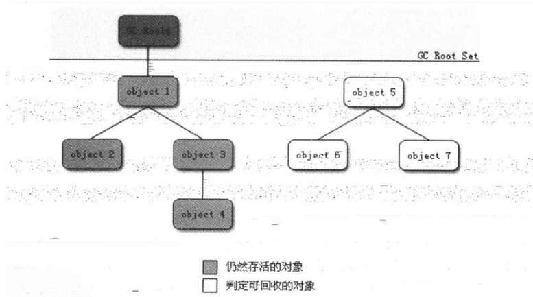 可达性分析算法是通过一些“GC Roots”对象作为起点,从这些节点开始往下搜索,搜索通过的路径成为引用链(Reference Chain),当一个对象没有被GC Roots的引用链连接的时候,说明这个对象是不可用的,如下图所示。