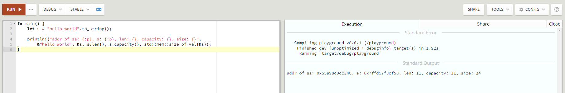 先来rust 的hello world ,查看这一句“hello world” 对应的内存使用情况