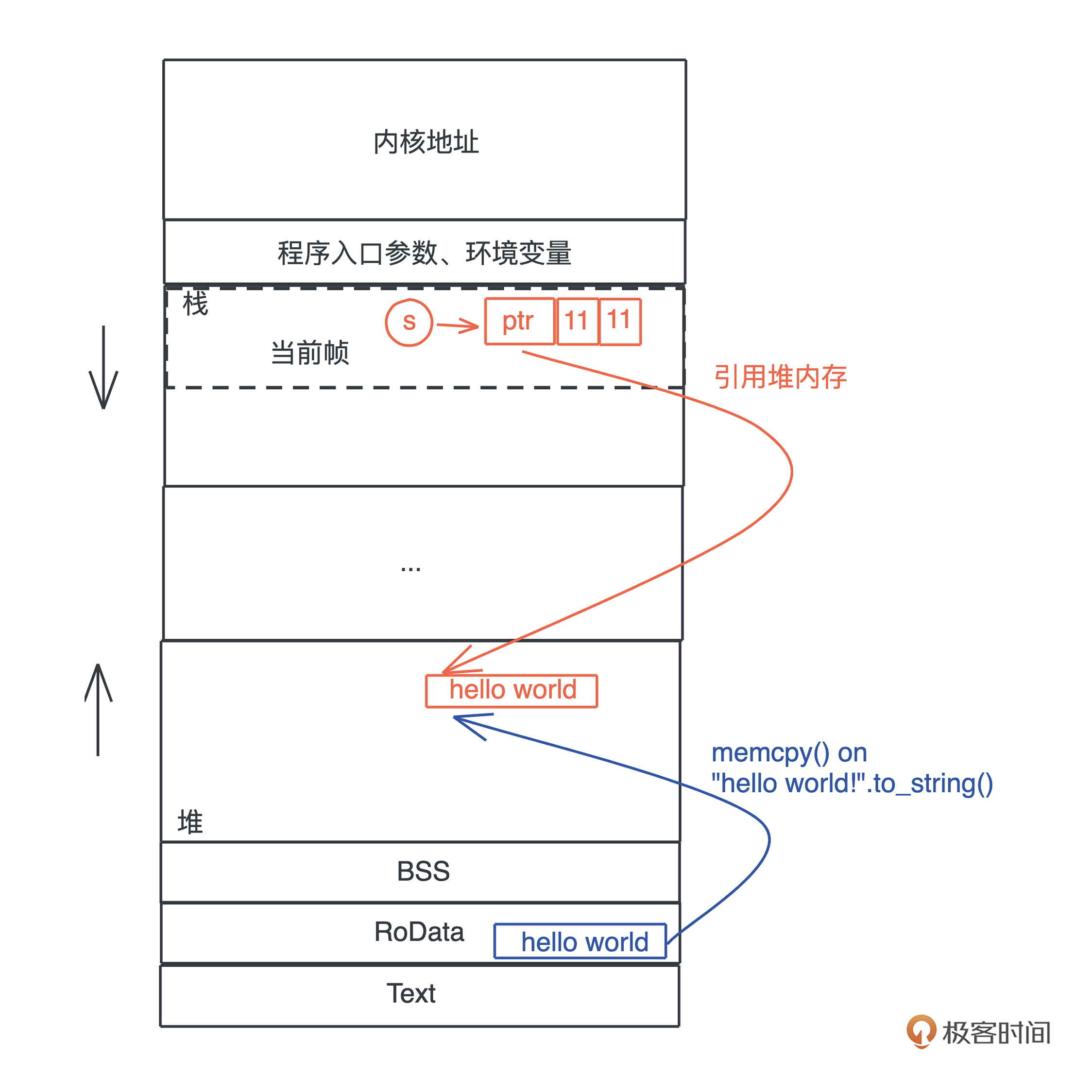 当“hello world” .to_string() 的时候,在堆上,一块新的内存被分配出来,并吧 “hello world” 逐个字节拷贝过去。